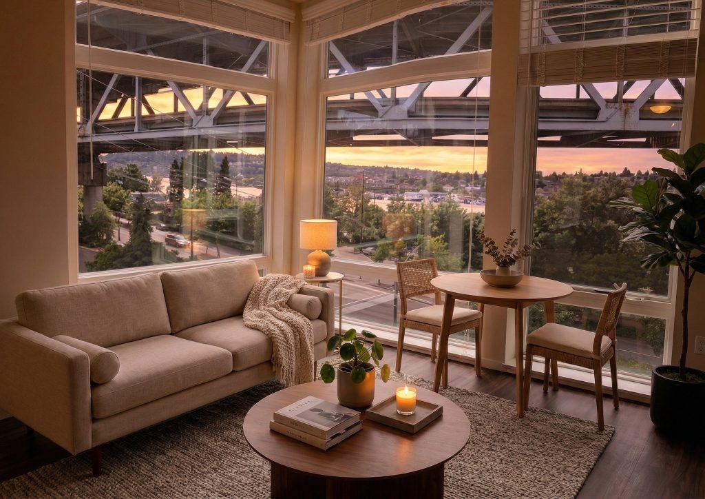 Discover spacious living in this modern apartment at Larson Building, Seattle, WA. Features a cozy sofa, stylish decor, and abundant natural light from large...