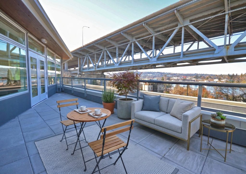 Experience urban living with outdoor dining space on this apartment patio at Larson Building in Seattle, WA. Enjoy views of the city skyline and iconic bridg...